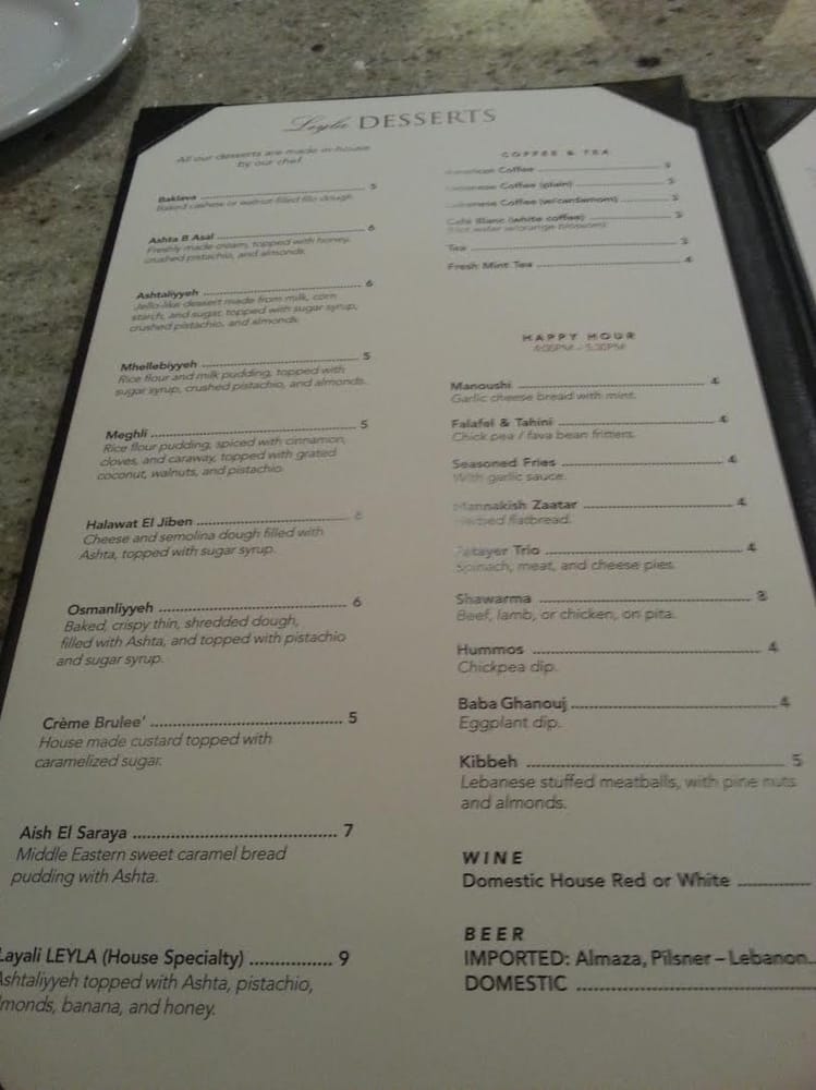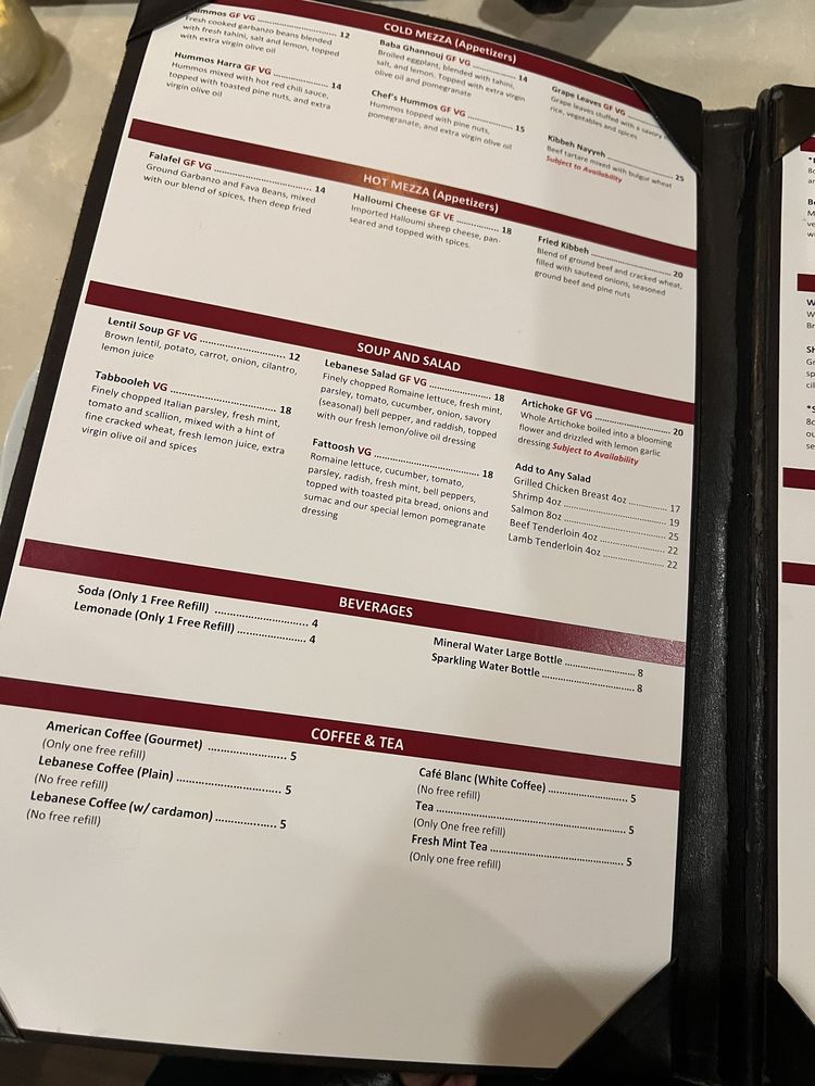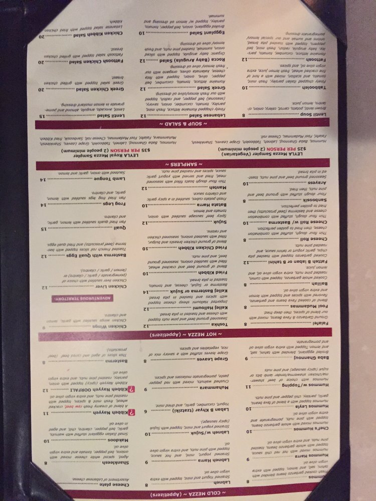Hummus, baba ghanouj, labneh, tabbouleh, grape leaves, shankleesh, muhammara, falafel, fool mudammas, cheese rolls, sanboosik, kibbeh (fried), shish tawook (chicken kebab), beef lula kebab, beef tenderloin kebab, and baklava.